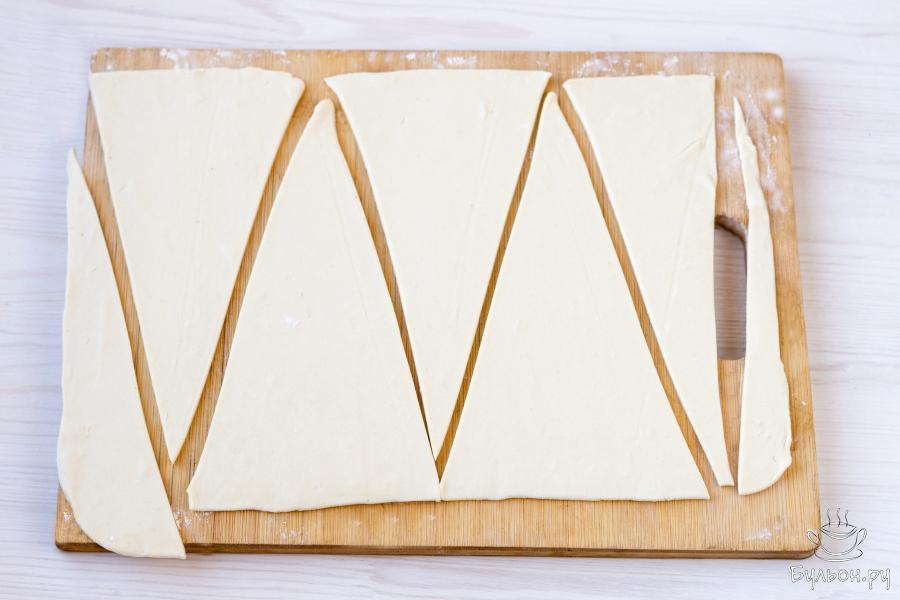 2. Присыпьте рабочую поверхность мукой и раскатайте слоеное тесто до толщины примерно 0.5 см. Нарежьте тесто на небольшие треугольники.