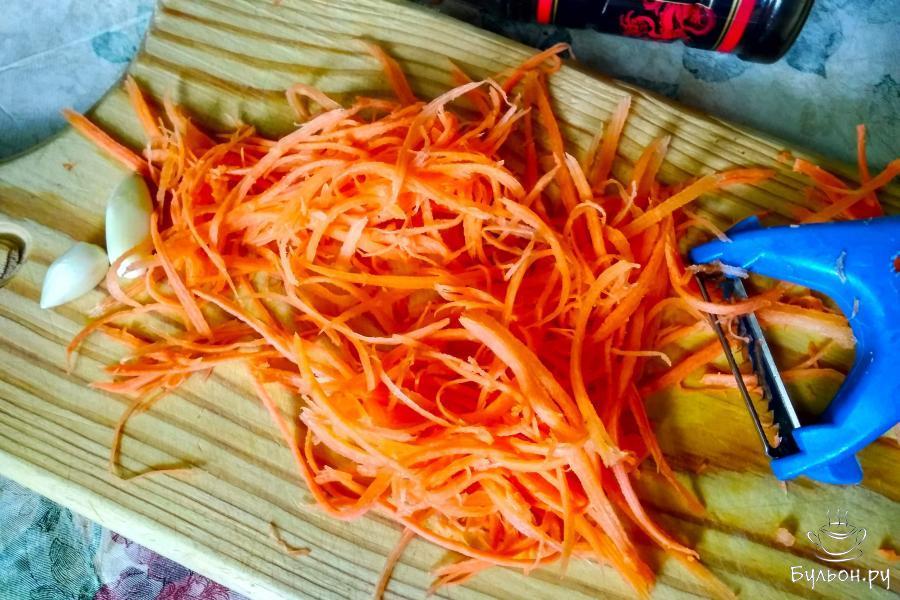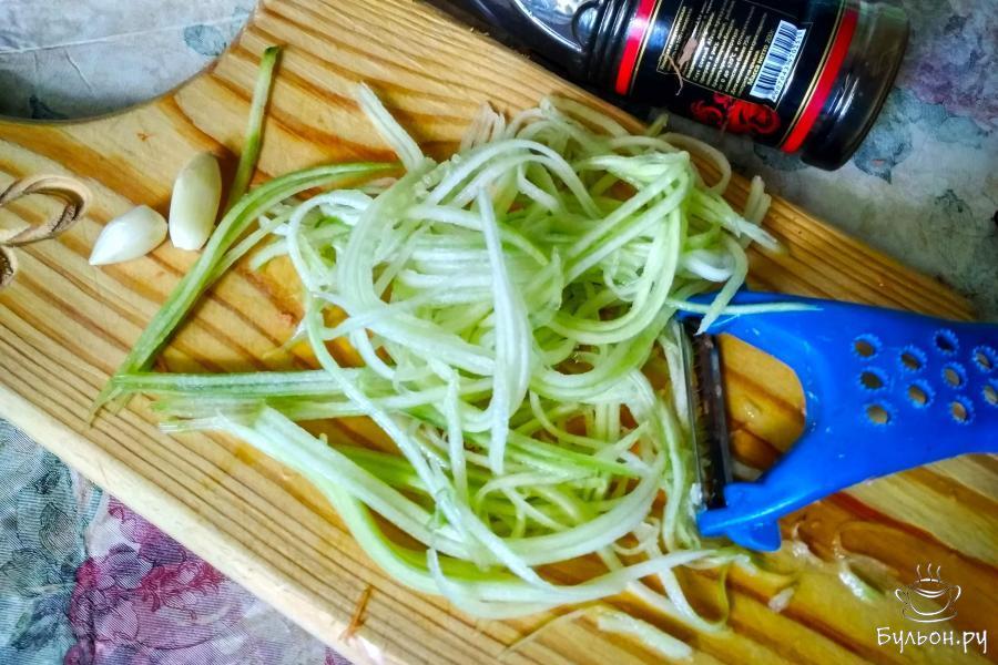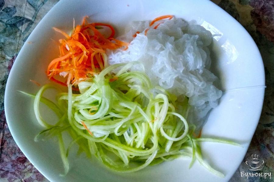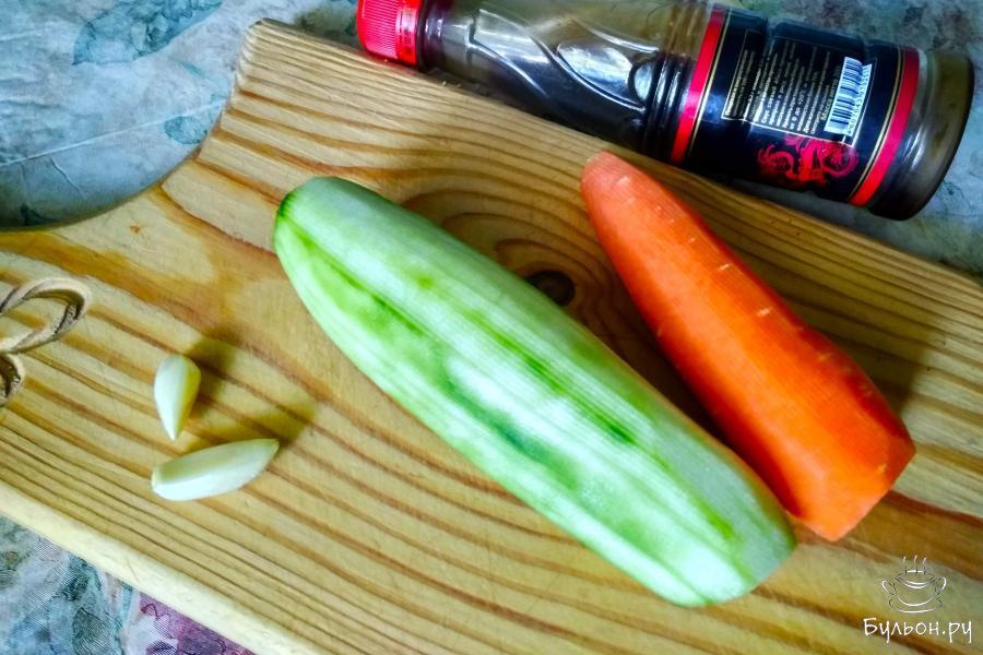 1. Предварительно отвариваем фунчозу согласно инструкции и хорошо промываем. Очищаем чеснок, огурец и морковь.