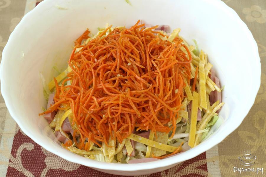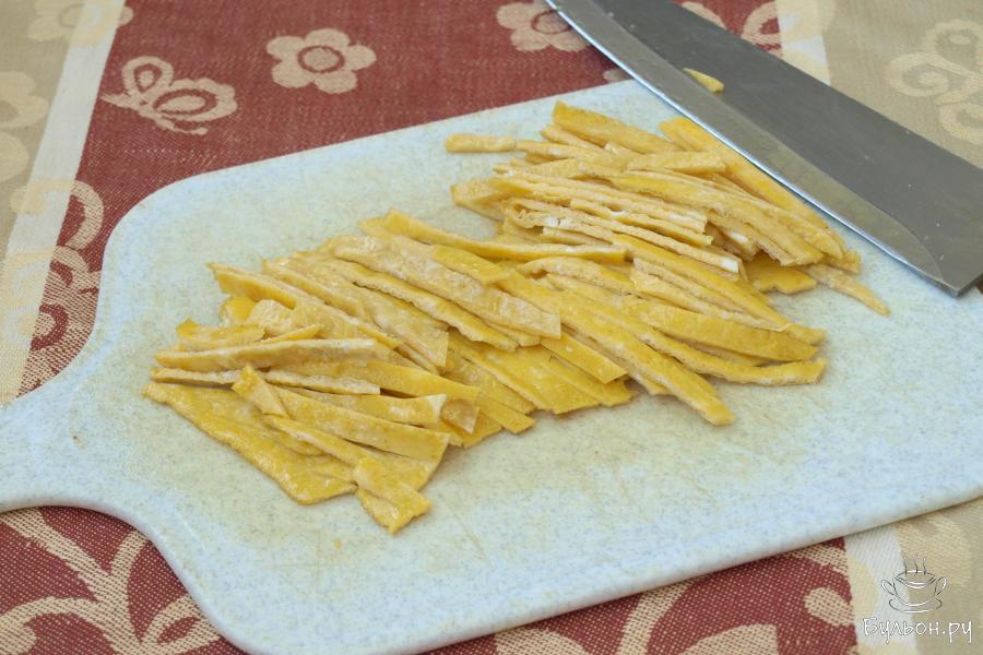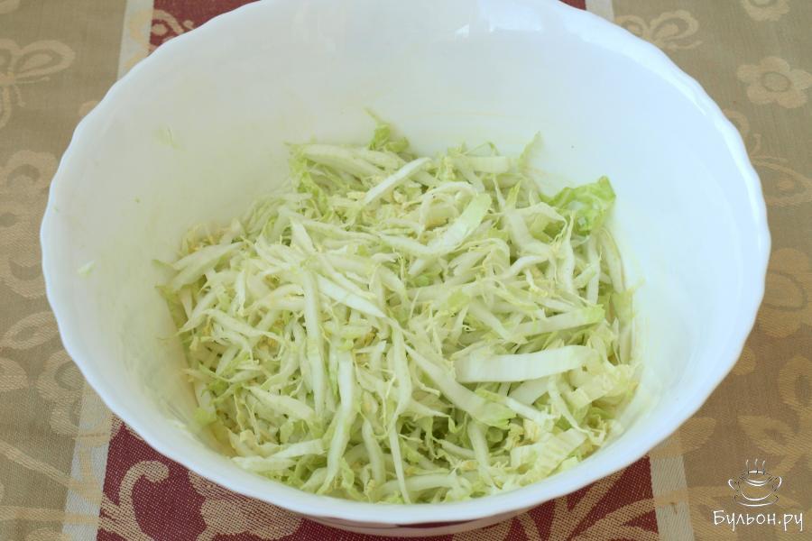 3. Пока омлет будет остывать, займемся нарезкой остальных ингредиентов. Тонко нашинкуем пекинскую капусту и сложим в глубокую миску.