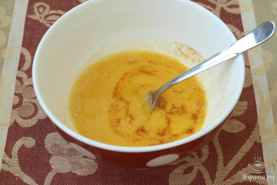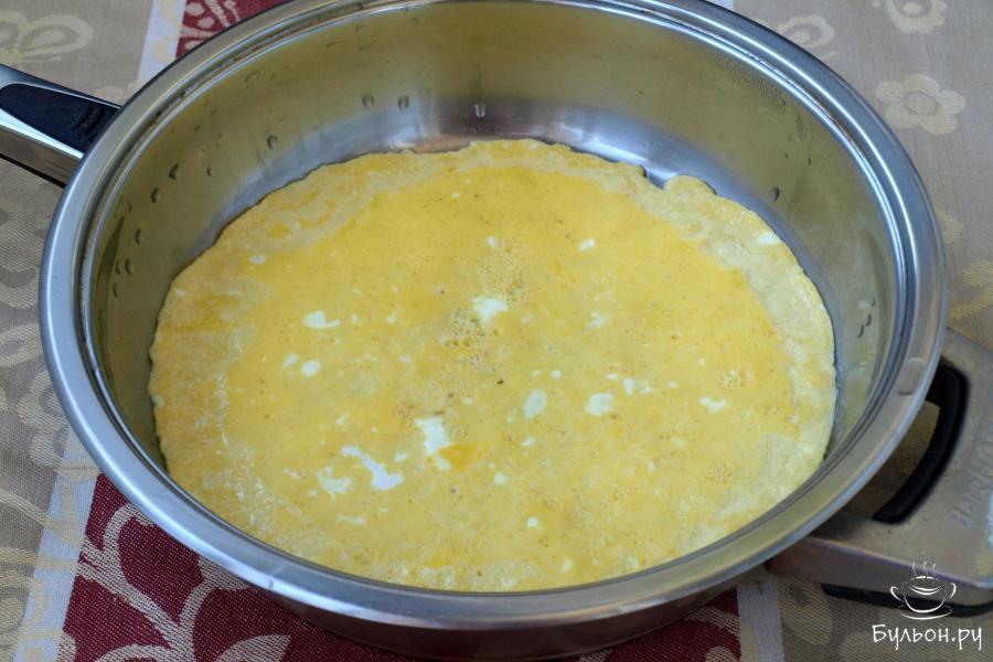 1. Приготовление начнем с омлета. В пиалу разбить 2 яйца, расколотить вилкой или венчиком, добавить соль и перец.