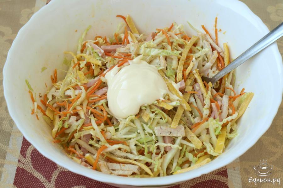 7. Перемешаем все составляющие салата, добавляя перец и соль по вкусу. Также добавим майонез. Еще раз хорошо перемешиваем.