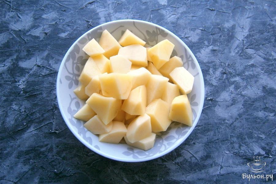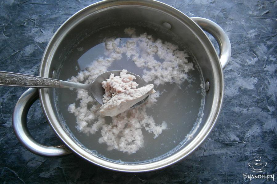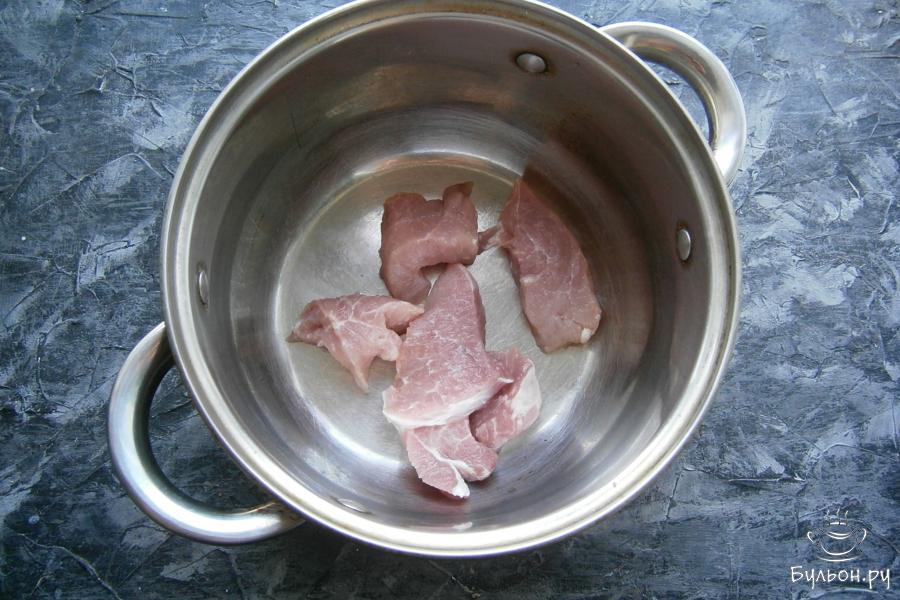 1. В подходящую по объему кастрюлю поместить крупные кусочки свинины. Я взяла мясо нежирное, без кости, можете использовать и с жирком, можно с косточкой. Залить мясо водой и поставить на огонь. Довести до кипения, воду посолить и варить мясо на небольшом огне 30 минут.