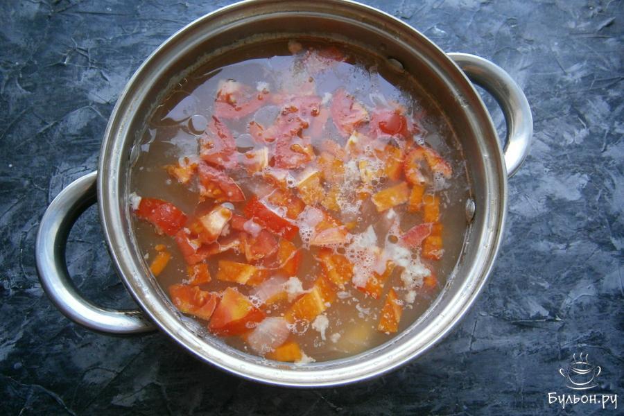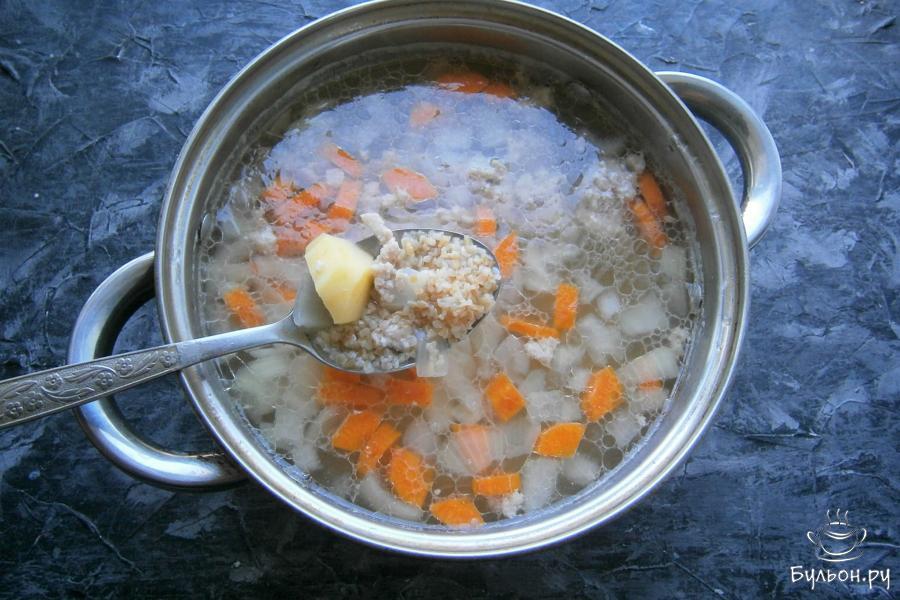 6. Далее, в кастрюлю добавить картофель, пшеничную крупу, растительное масло, порезанный кусочками лук и прорезанную кубиками морковь. Варить все далее минут 15.