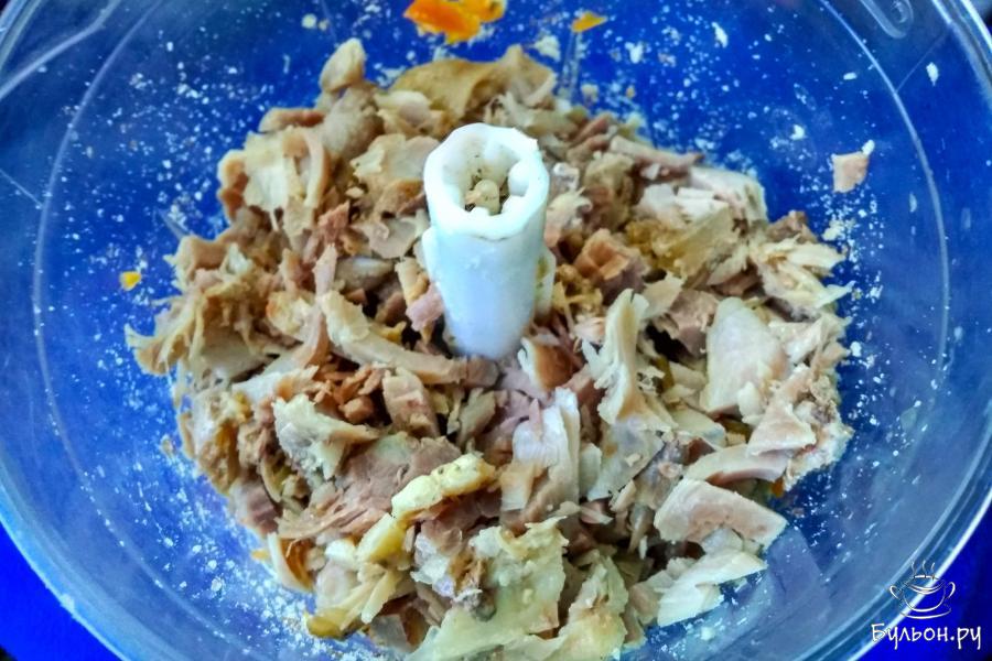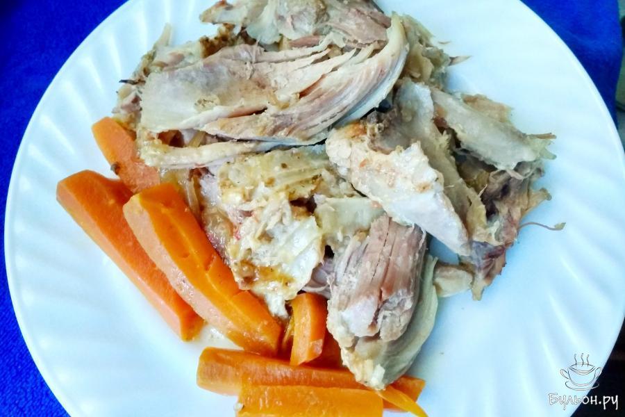 1. Предварительно отвариваем куриные бедра и морковь. Куриное мясо и морковь вынимаем из бульона только непосредственно перед началом готовки.