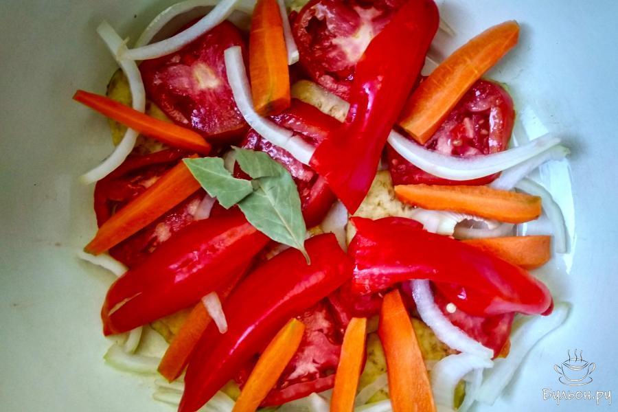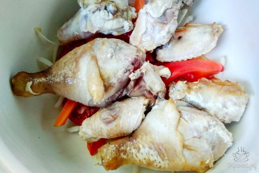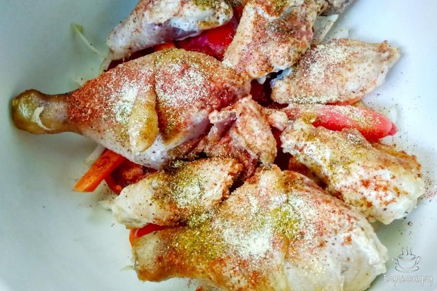 5. Добавляем соль, черный перец, красный перец, сухой укроп и кинзу, сухой чеснок и хмели-сунели. Заливаем стаканом кипятка и тушим на медленном огне 1,5 часа. При необходимости добавляем жидкость.