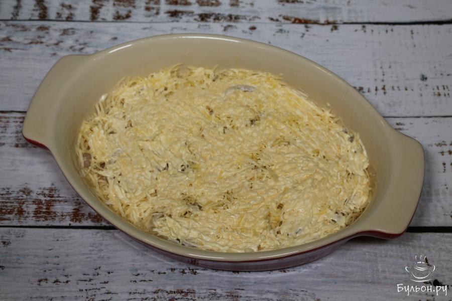 4. Следующим слоем будет натертый сыр на мелкой терке, который необходимо смазать тонким слоем майонеза, насколько это возможно.