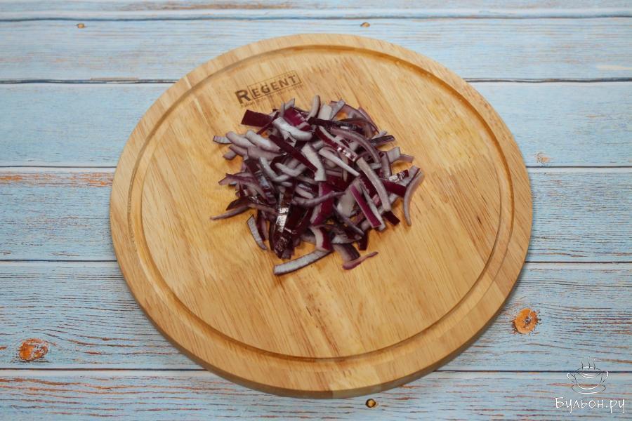 2. Красный лук разрежем на 4 части, один раз вдоль, один поперек. Теперь каждую часть тонко нашинкуем, чтобы получить продолговатые тонкие кусочки лука.