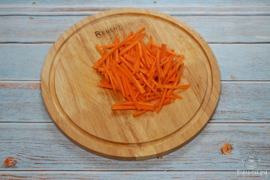 3. С моркови снимем кожицу и с помощью овощечистки, или нарежем ее любым удобным способом, чтобы в итоге получить длинную соломку.