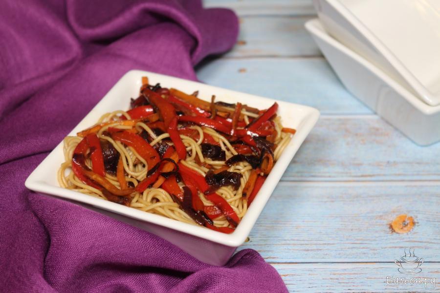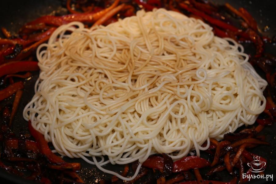 7. Добавляем к обжаренным овощам лапшу, соус терияки и еще оставшийся соевый соус. В течение нескольких минут оставляем сковороду на огне, при этом постоянно помешиваем лапшу с овощами.