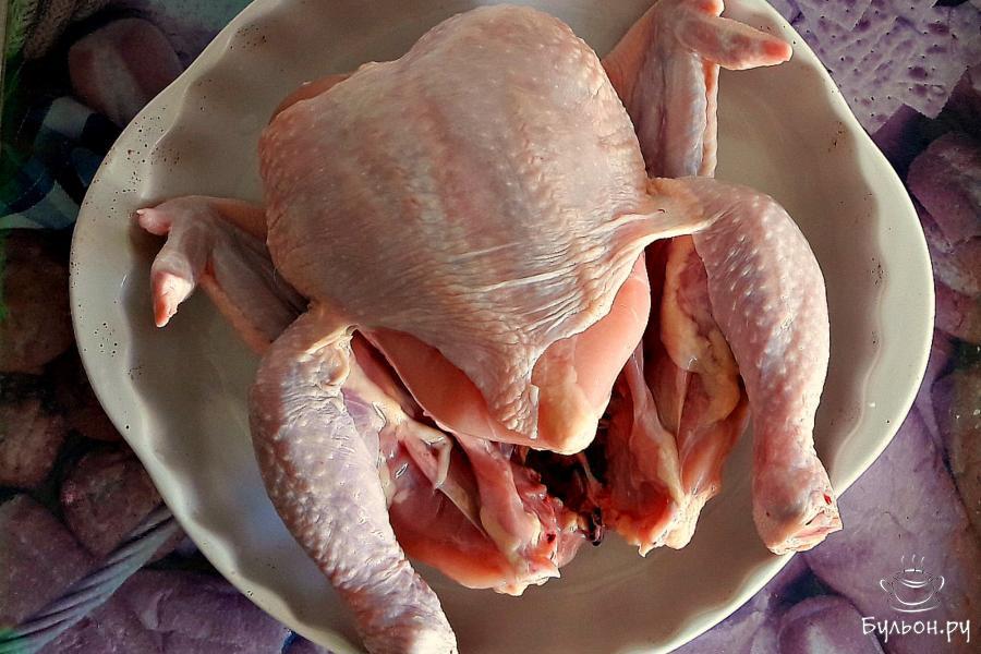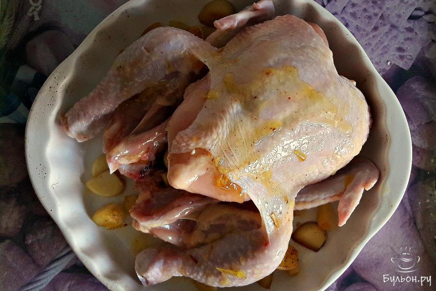7. Дольки чеснока выкладываем под курицу, рядом с нею и обязательно кладем некоторое количество зубчиков внутрь птицы.