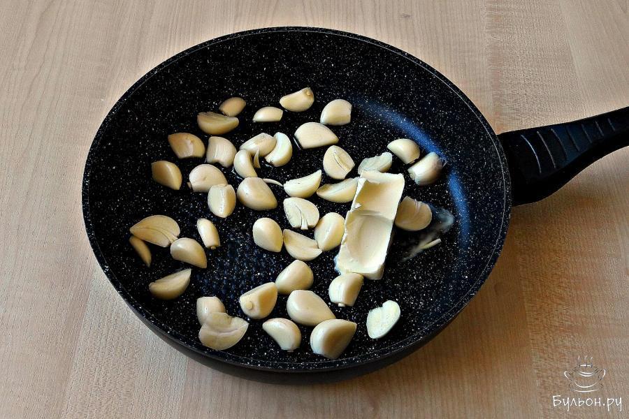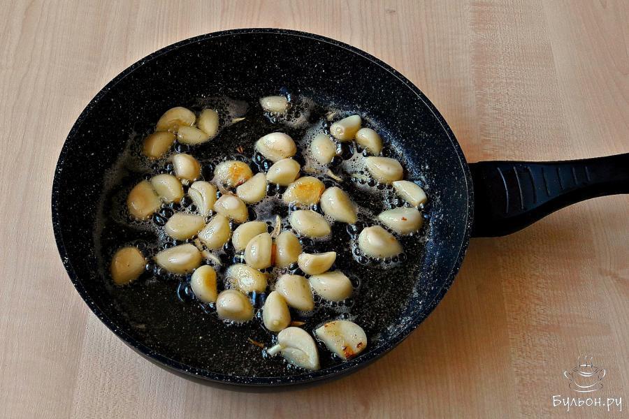 4. Готовим в течение 5-7 минут на сильном огне. Постоянно перемешиваем, чтобы ничего не подгорело и масло максимально напиталось ароматом, вкусом чеснока. После огонь выключаем, оставляем сковородку на плите еще минут на 5-7.