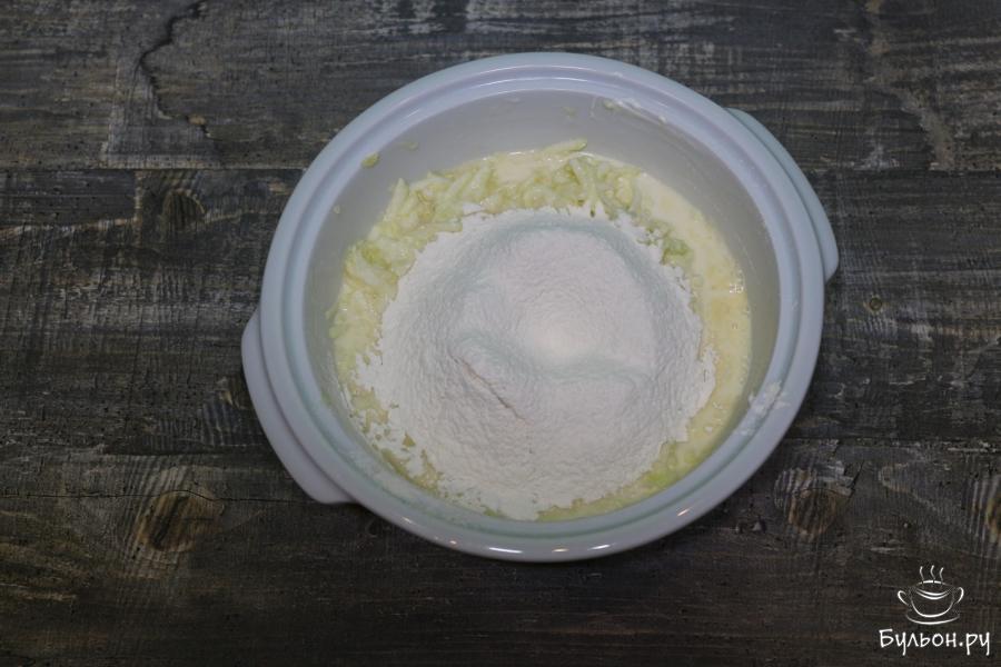 3. Далее к этой смеси добавим просеянную через сито муку. Еще раз все тщательно перемешаем таким образом, чтобы не было комочков.