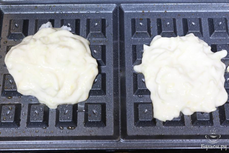 5. Когда прибор будет готов к работе, т. е. нагрет, открываем верхнюю его крышку, кладем 1 столовую ложку в центр каждого квадрата в панели. Закрываем крышку и печем овощные вафли примерно 7-10 минут до светлого, золотистого цвета. Время приготовления зависит от мощности техники.