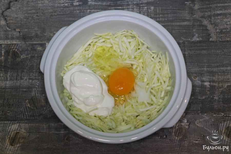 2. Уже натертый кабачок перекладываем в большую глубокую емкость. В которую также добавляем следующее: вбиваем 1 яйцо, кладем сметану, всыпаем соль. Перемешиваем все составляющие емкости.