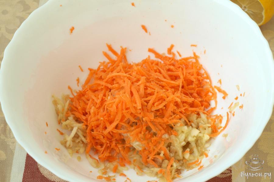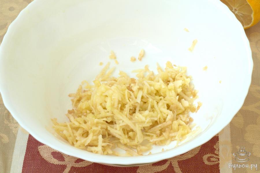 1. Очистить яблоко и натереть его на терке. Поместить в салатник. По желанию яблоко можно также нарезать соломкой. Сразу же полить лимонным соком для того, чтобы мякоть не потемнела.
