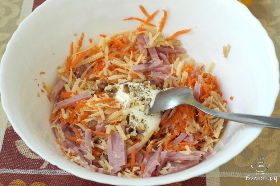 5. В салат добавить майонез, нарубить ножом грецкие орехи, посолить и поперчить. Хорошо перемешать все ингредиенты и подать салат к столу, выкладывая сверху сухарики. Приятного аппетита.