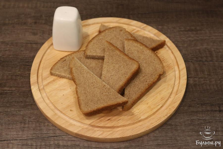 1. В начале подготовим хлеб, масло и соль. Я предлагаю готовить бутерброды именно с ржаным хлебом, поскольку так вкуснее. Но можно использовать и пшеничный, и отрубной. Хлеб режем пополам, подсаливаем его, после чего жарим на сковороде с добавлением растительного масла по 2-3 минутки с каждой стороны.