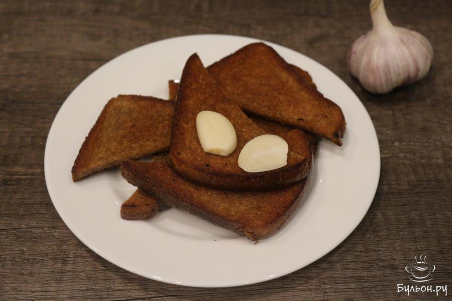 2. Теперь натрем зубчиком чеснока уже обжаренные хлебцы, сделав их таким образом ароматными. Затем смажем майонезом будущие бутерброды.