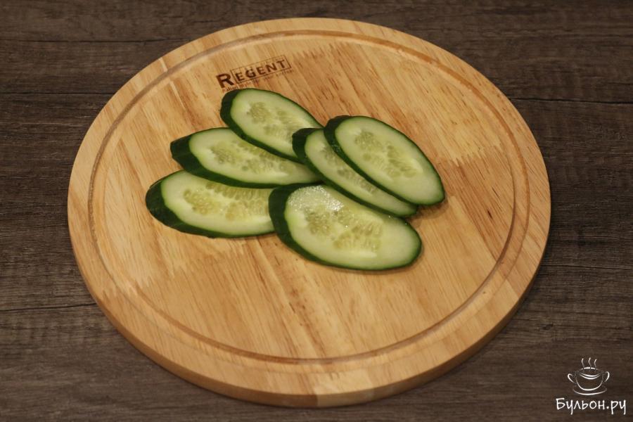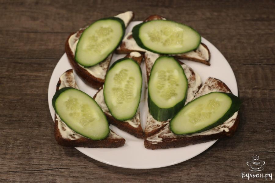 3. Огурец нарежем нетолстыми кружочками или кусочками продолговатой формы. Это зависит от того, какой формы у вас кусочки хлеба: длинные, продолговатые, треугольные.