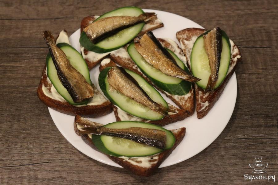 Бутерброды со шпротами на жареном хлебе это довольно жирная, очень калорийная, сытная закуска. Чтобы придать им нотку свежести, в данном рецепте используется свежий огурец, который делает вкус бутербродов интереснее и богаче. А чтобы сделать бутерброды ароматными, смажем их чесноком. В не зависимости от того, что бутерброды очень простые, их часто подают на праздничный стол. И разлетаются они очень быстро.