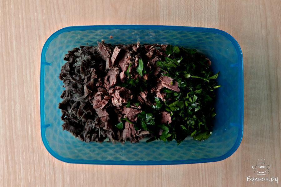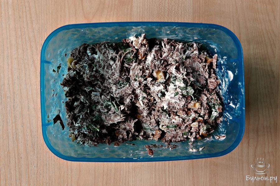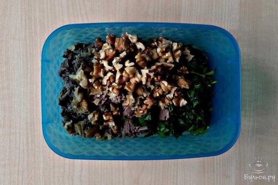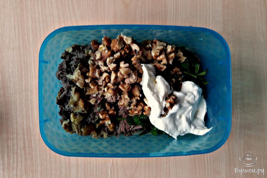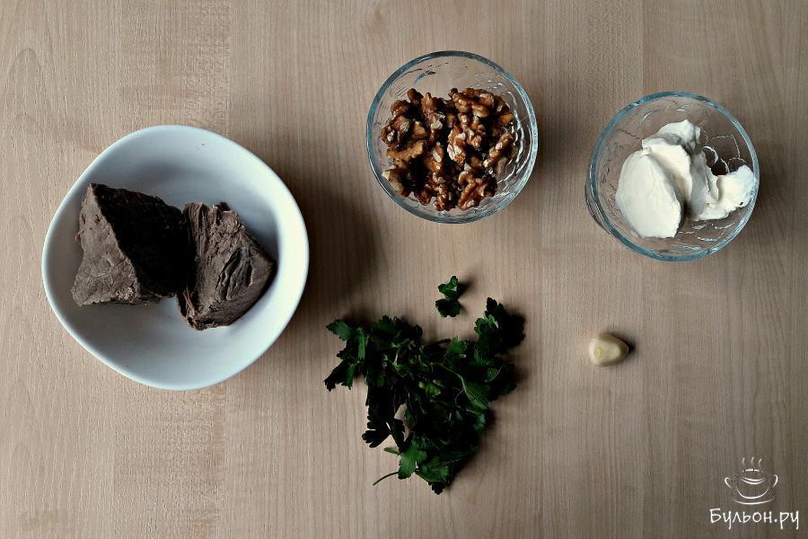1. Для приготовления армянского салата Цехтон нам потребуются следующие продукты: отварная говядина, грецкие орехи, петрушка, чеснок, сметана, соль и перец.
