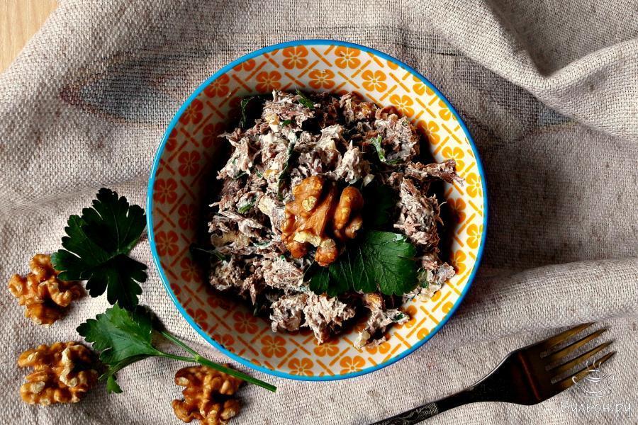 Салат Цехтон - это блюдо армянской кухни. Конечно же, я не претендую на полную оригинальность, но основные моменты соблюдены в полной мере. Блюдо получается по-настоящему вкусным и полезным: говядина - прекрасный источник белка и железа, грецкие орехи вообще не нуждаются в представлении, они признаны одними из самых полезных, зелень и чеснок также являются источником антиоксидантов и фитонцидов. Даже в качестве заправки для салата Цехтон принято использовать не какой-нибудь майонез, а сметану. Это тот редкий случай, когда польза и вкус не противоречат, а лишь дополняют друг друга.
