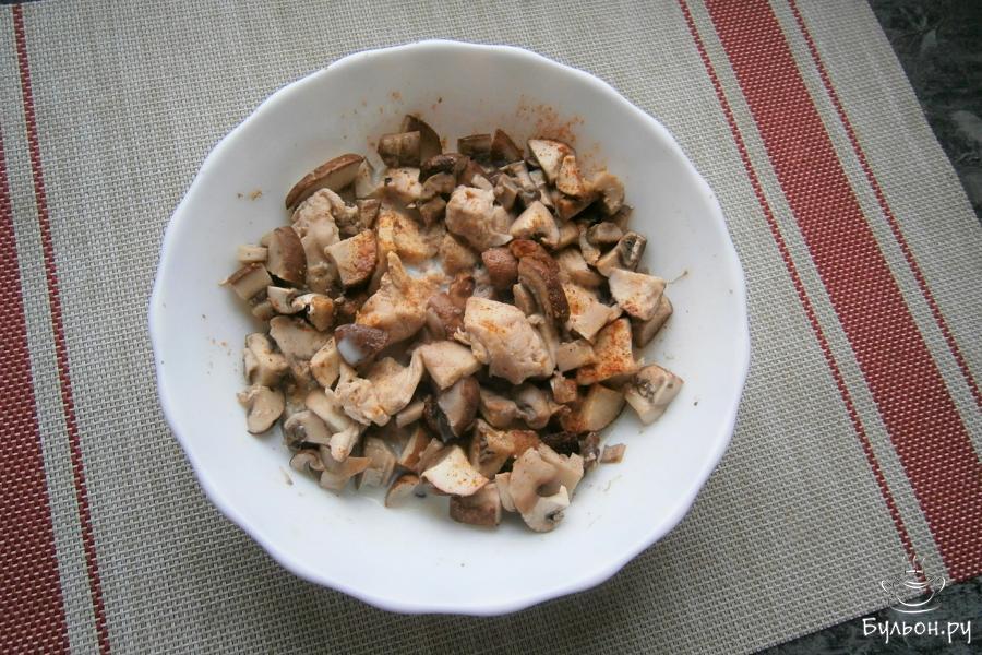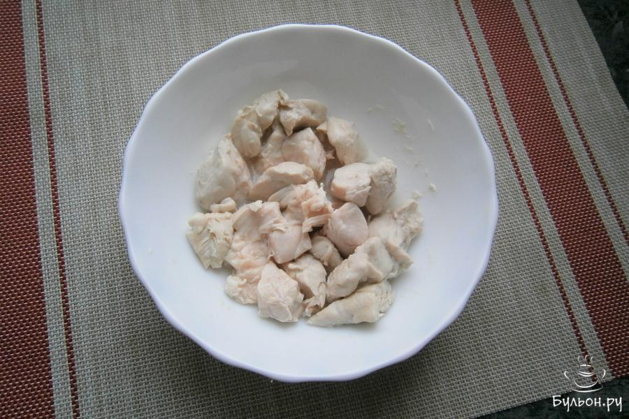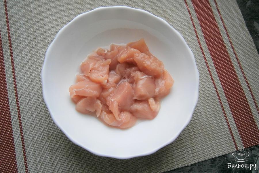 1. Куриное филе порезать небольшими кусочками, выложить их в миску или кастрюльку, пригодную для готовки в микроволновой печи, влить 20 мл воды.