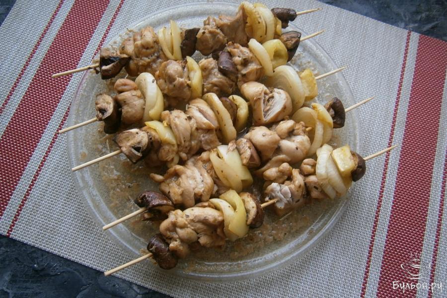 8. Деревянные шпажки предварительно замочить в горячей воде мин. на 10 и нанизать на них кусочки курицы чередуя их с шампиньонами и овощами. Разместить шашлыки на большой тарелке, которая находится в комплекте к СВЧ.