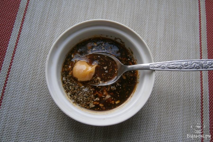 5. Также, добавить в маринад ложечку меда и очень тщательно все перемешать, чтобы не осталось вкраплений меда.