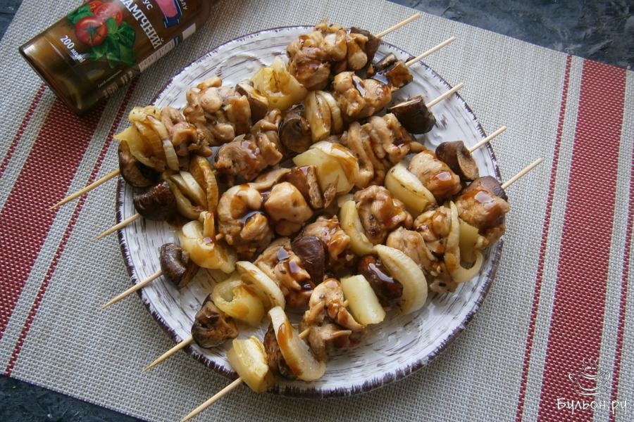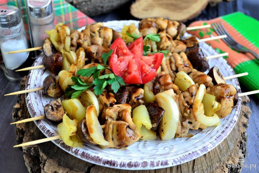 10. За 16 минут у вас получится изумительные шашлычки из курицы, которые нереально вкусно полить бальзамическим соусом (20 мл) или же, по-желанию, вашим любимым соусом. Подавать шашлыки нужно в горячем виде.
