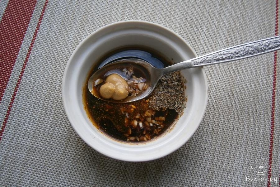 4. К соевому соусу добавить черный перец, горчицу, орегано, мелко порезанный чеснок, влить яблочный уксус, растительное масло и 30 мл бальзамического соуса.