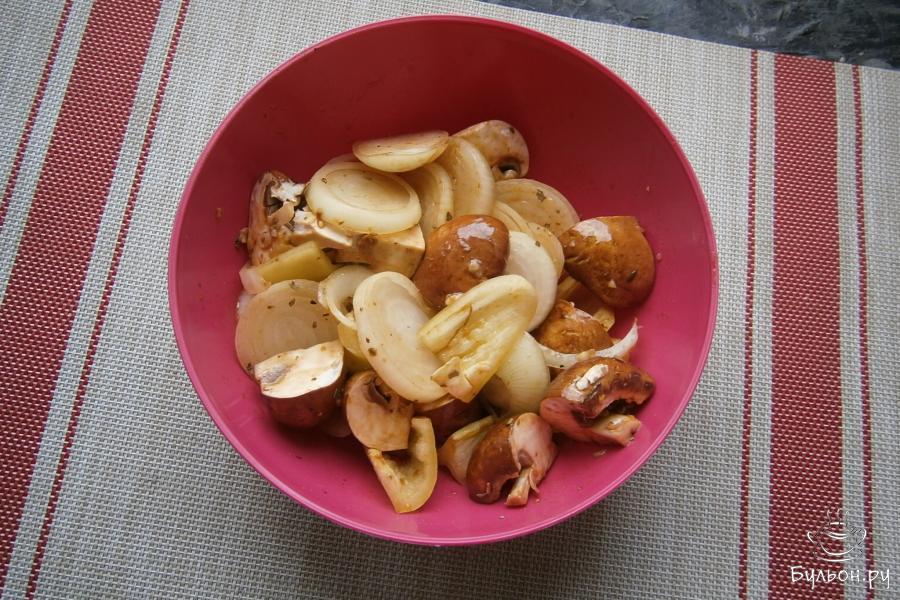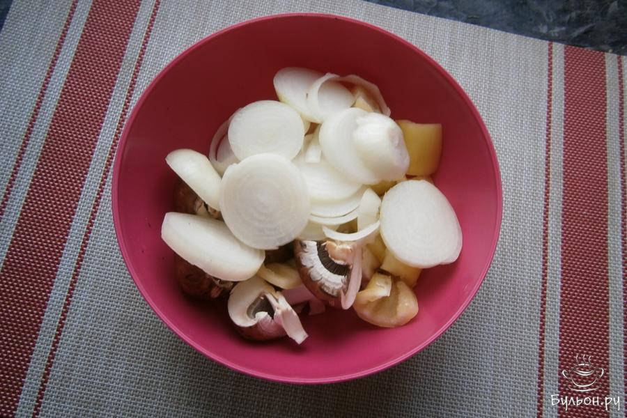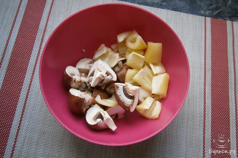 2. В отдельную миску болгарский перец порезать средними кусочками, шампиньоны порезать на 2-4 части.