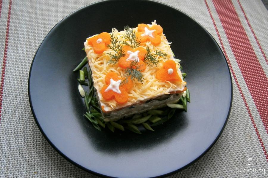 10. Салат оставить для пропитки минут на 15, после этого, формочку аккуратно снять, а салатик украсить морковкой и зеленью. Зеленый лук измельчить и распределить его по тарелке вокруг салата.