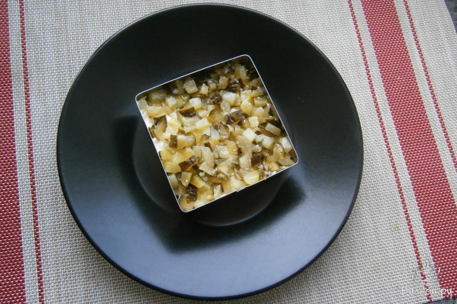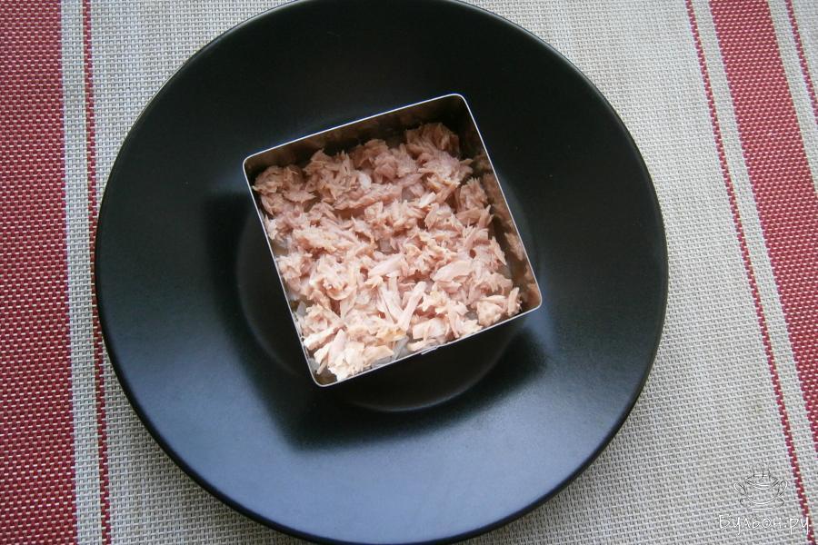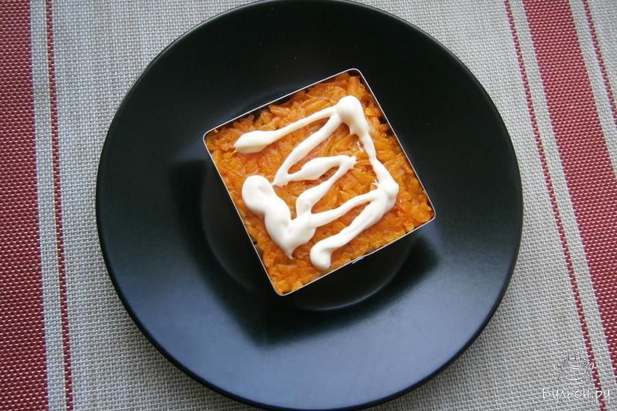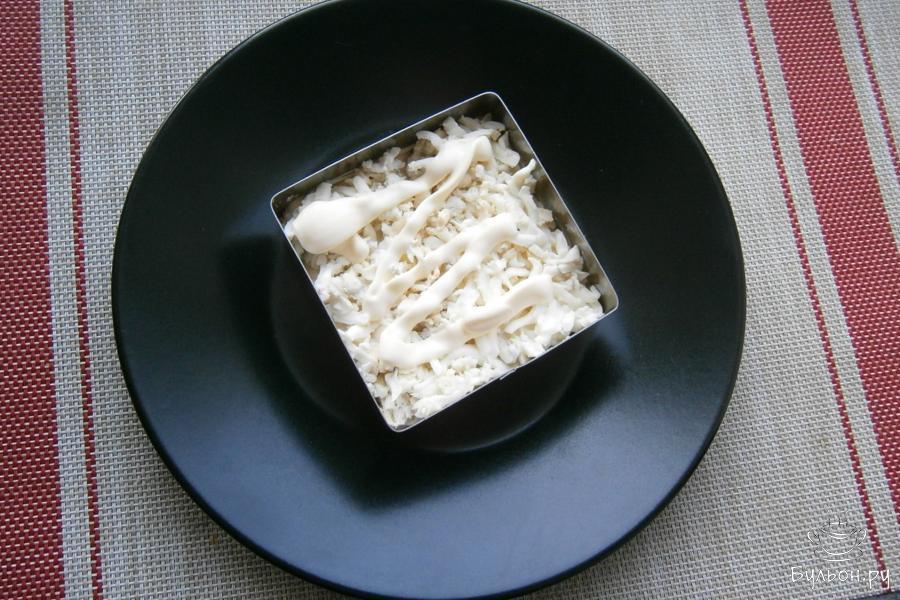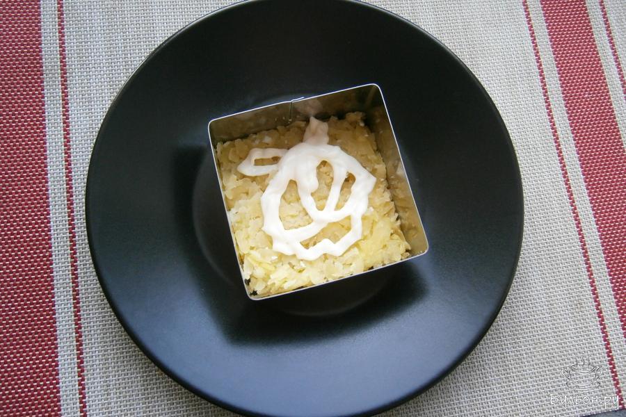 4. На тарелку поместить формочку, выложить тертый картофель, чуть посолить его, смазать ложкой майонеза.