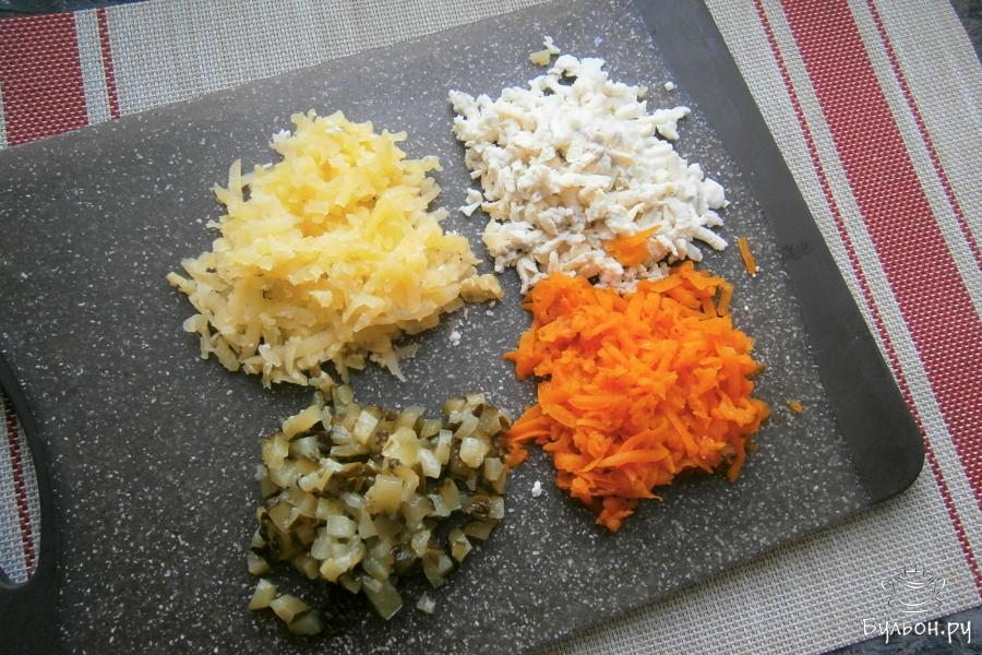 2. Предварительно отварить морковку, картофель в кожуре и яйцо. Дать продуктам остыть и почистить их. Картофель, одно яйцо и небольшую морковку натереть, маринованный огурчик мелко порезать.