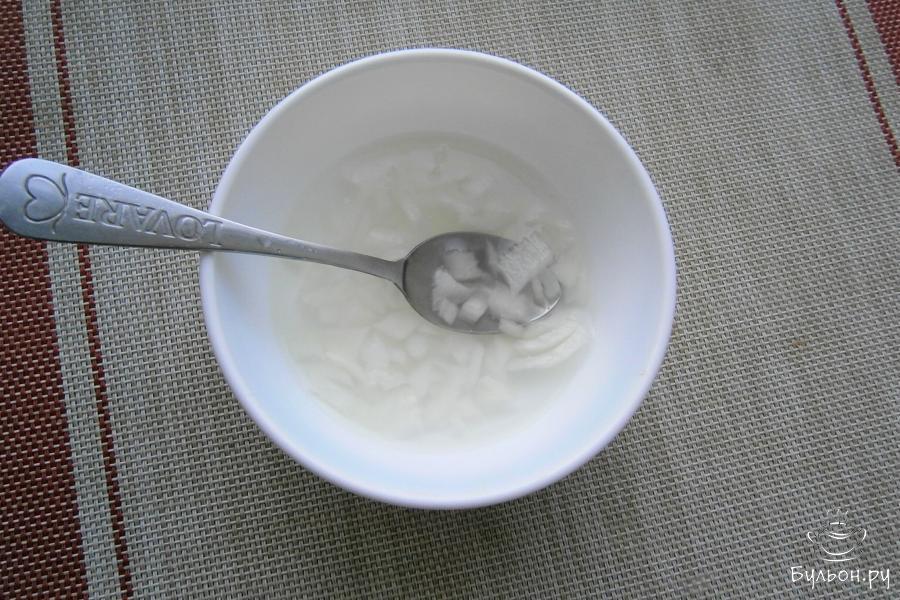 1. Репчатый лук мелко порезать и залить его крутым кипятком минуты на 2-3. Воду слить, лук остудить.