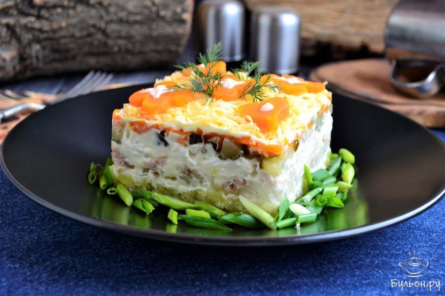 Красивых, красочных, интересных салатов существует множество и главное, выбрать из этого изобилия вкусный салатик. Один из таких салатов я хочу вам и предложить - это салат с тунцом, маринованным огурчиком и сыром, который готовится слоями. Выкладывать его слои можно в общий салатник, а можно - на отдельные тарелки порционно используя круглую или квадратную формочку. При несложном оформлении салатик будет выглядеть очень аппетитно и ярко, а то, что он очень вкусен - не сомневайтесь.