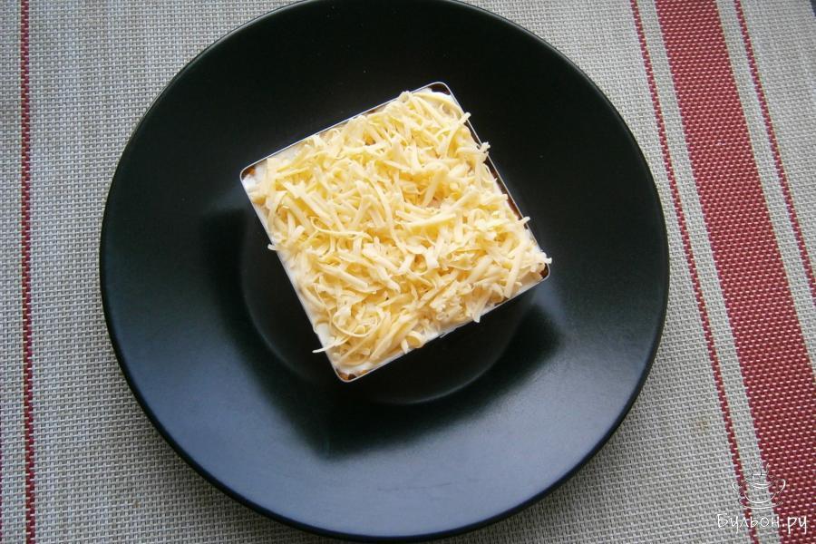 9. Сверху, последний слой - слой любого тертого твердого или полутвердого сыра, майонезом не смазывать и не придавливать этот слой.