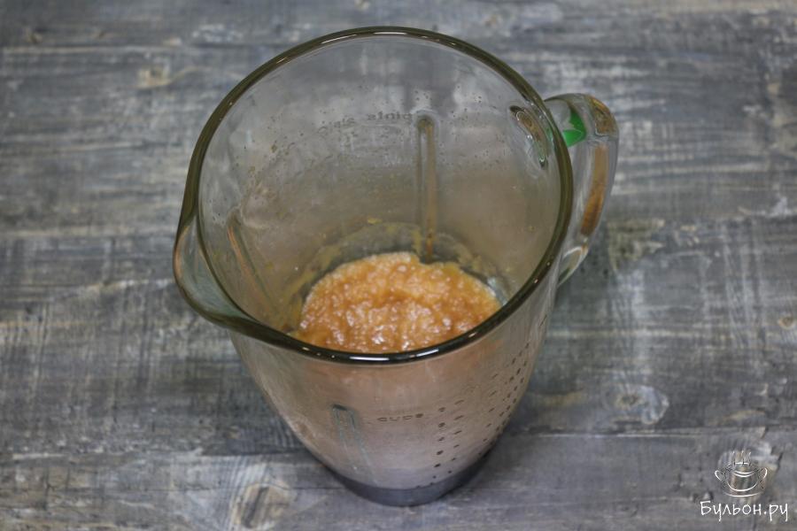 6. Как только масса закипит, снимаем с плиты кастрюлю и переливаем горячую массу в блендер или в сито. Соответственно, измельчаем массу в блендере или протираем ее через сито. В итоге получим что-то, напоминающее пюре из яблок.