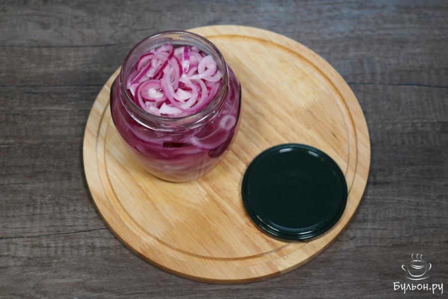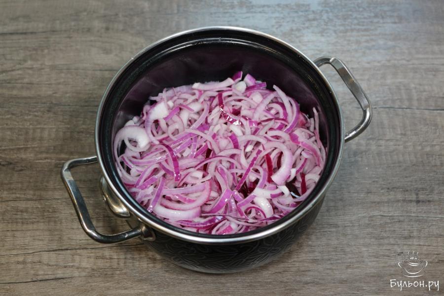 5. После того как маринад прокипел 2 минуты, добавляем в него полукольца лука и выключаем огонь. Даем луку полежать в маринаде буквально минуту.