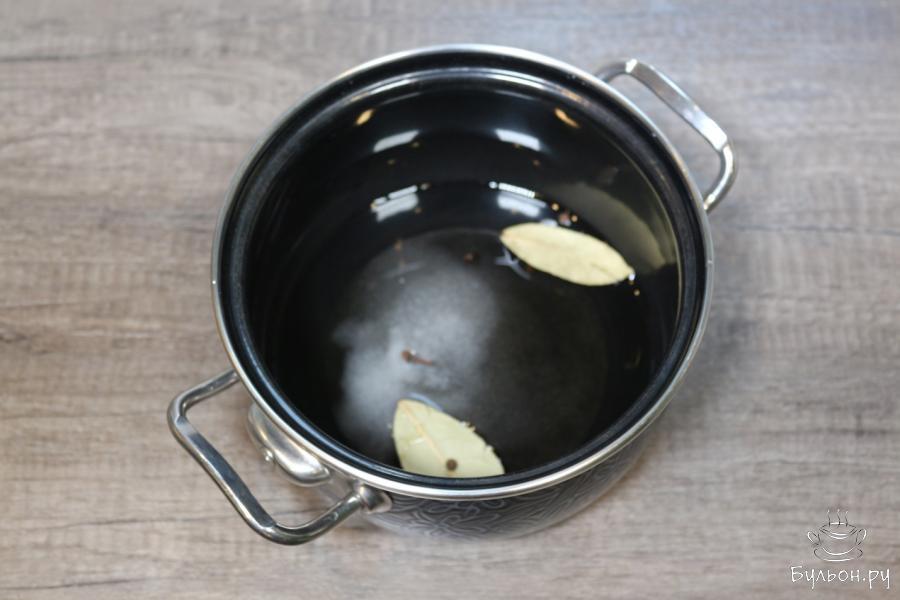 2. Итак, приготовим маринад для красного лука. Для этого понадобятся кастрюля небольшого размера или сотейник, вода, а также сыпучие ингредиенты и пряности: соль, сахарный песок, перец горошком, лавровые листики, гвоздика. Все это кладем в кастрюлю с водой.