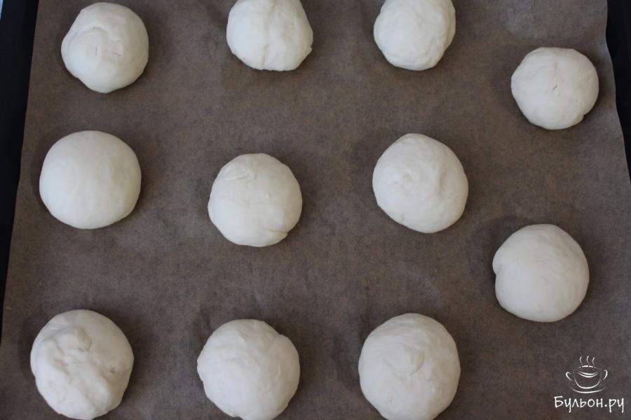 4. Через указанное время тесто обмять и разделить на 10 шариков. Переложить их на противень, застеленный бумагой, и дать время на расстойку, примерно, 20 минут.