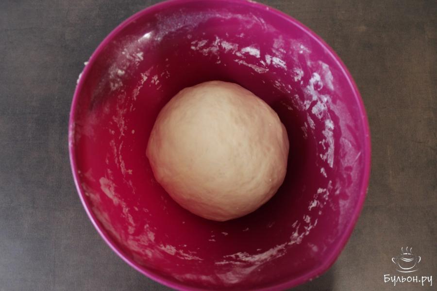 3. Когда мука будет введена, руки слегка необходимо смазать рафинированным маслом и вымешивать тесто вручную около 10 минут. Накрыть тесто тряпочкой и оставить в теплом месте без сквозняков на 1 час. За 40-60 минут тесто вырастет в 2 раза.