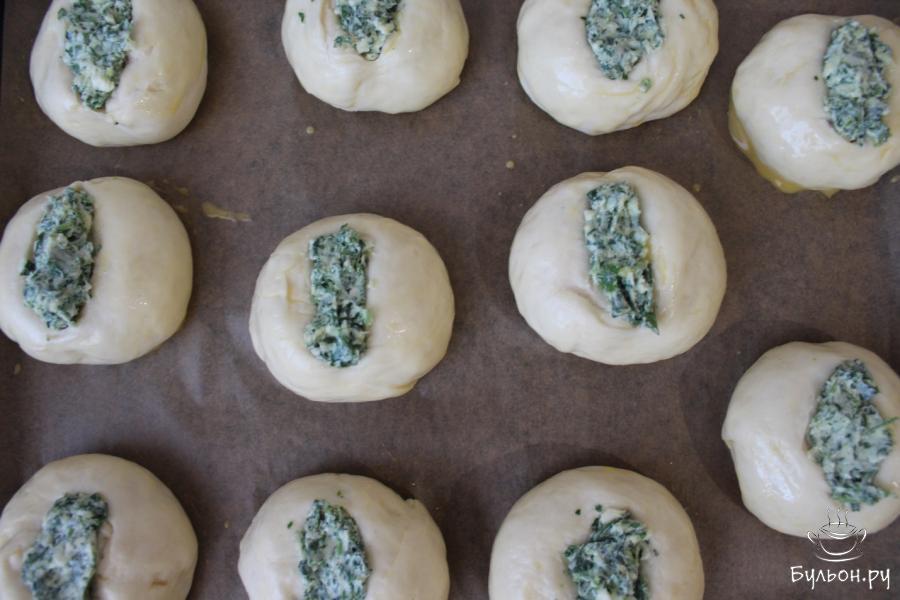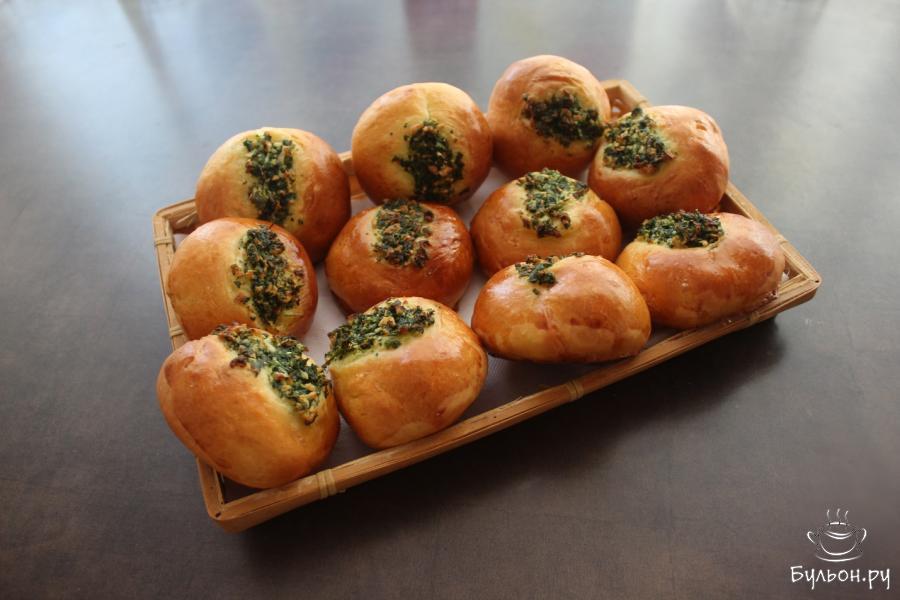 6. В булочках сделать посередине достаточно глубокие надрезы, выложить в эти прорези чесночное масло с зеленью. Смазать желтком, смешанным с 1 ст. л. воды.