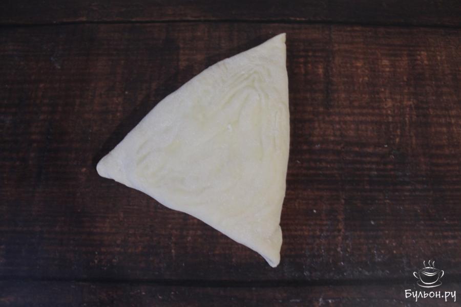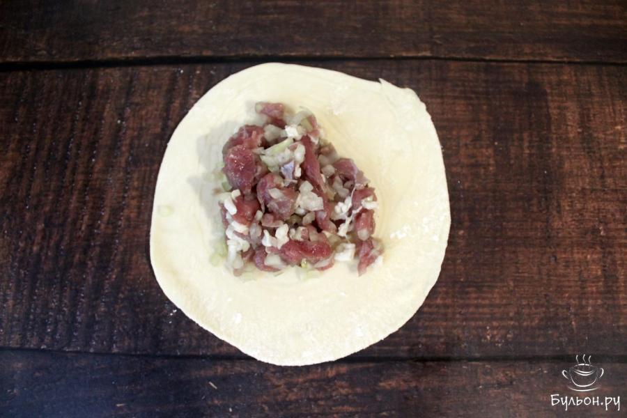 10. У меня получилось 14 таких заготовок. Берем первую заготовку из теста для самсы, тонко раскатываем, выкладываем в центр начинку (примерно 1 ст. л.).