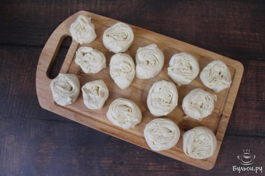 9. Раскатываем следующий кусок теста, снова промазываем маслом, на него выкладываем первый рулет и закручиваем. Проделываем то же самое с еще одним куском теста. Один толстенький рулет разрезаем на заготовки. Прячем заготовки в морозилку на 20 минут, за это время должно схватиться сливочное масло.