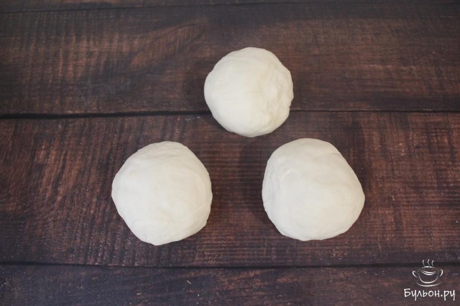 3. Удаляем шкварки, а сам растопленный жир вводим в тесто. Вымешанное тесто делим на 3 куска. Берем 3 пакета и каждый кусок теста убираем в свой пакет. Даем тесту отдохнуть от 30 до 40 минут.