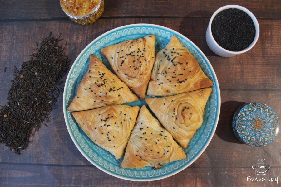 11. Защипываем края, переворачиваем и переносим на смазанный растительным маслом противень. Даем самсе постоять 15 минут.