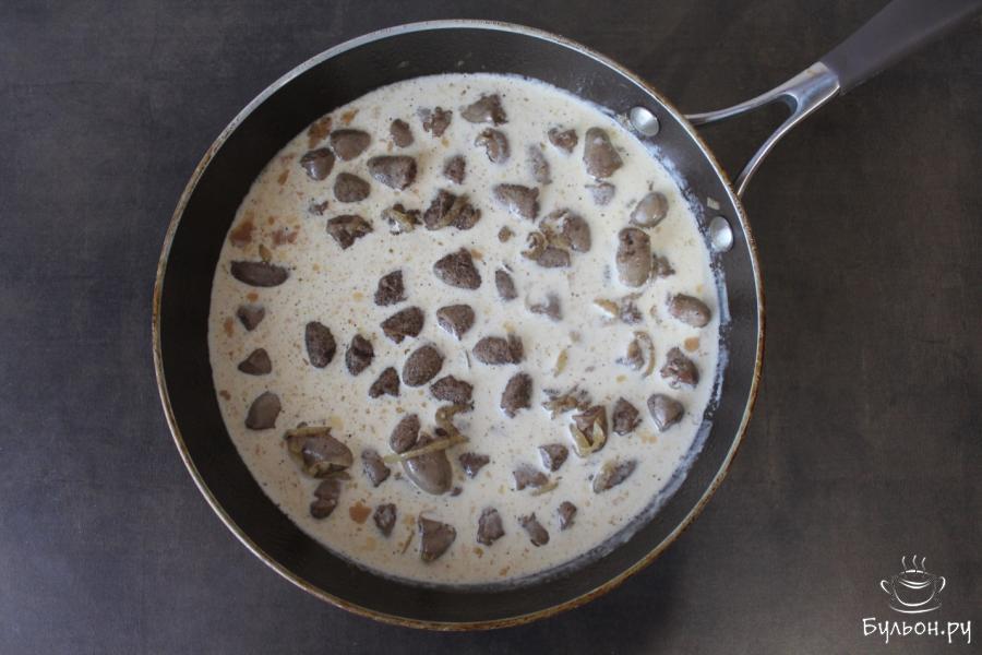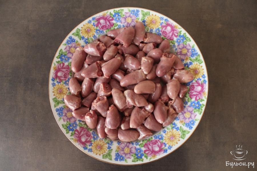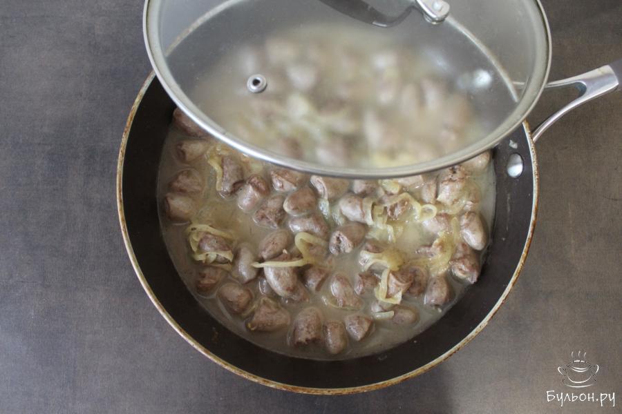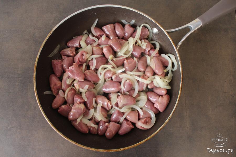 3. К луку добавить очищенные сердечки и 10 минут готовить их на огне, сердечки должны поменять цвет.