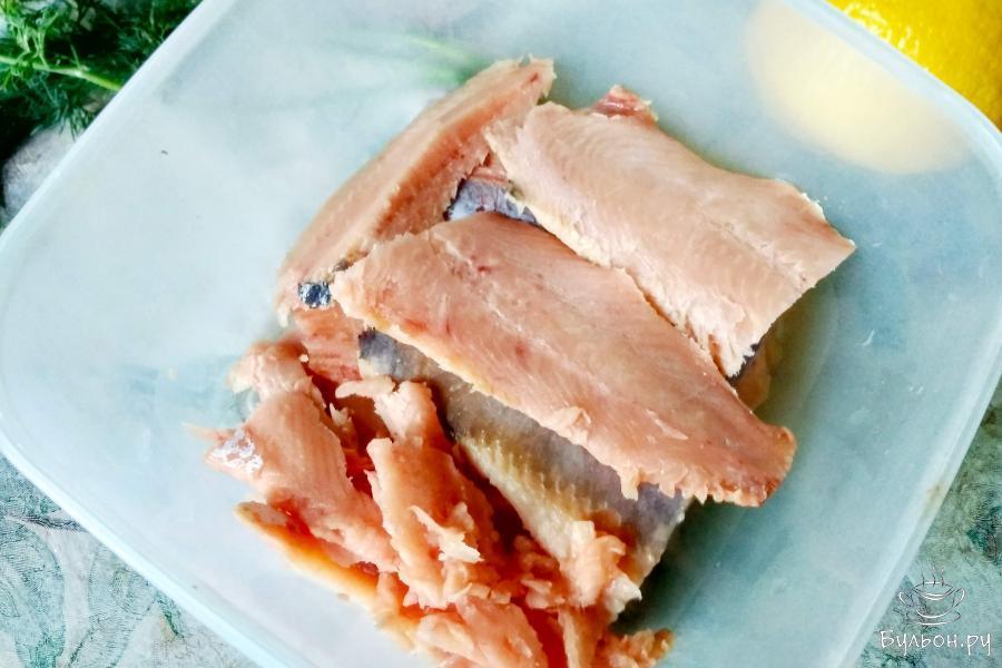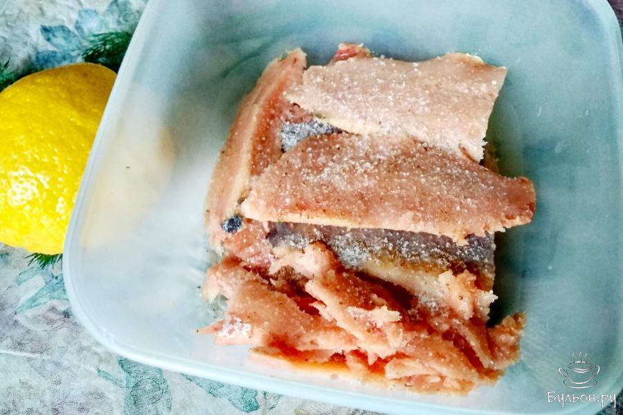 2. Начинаем разделывать рыбу: убираем голову, хвост, плавники. Снимаем кожу. Разделываем рыбу на филе. Укладываем в посуду для засолки. Удобнее всего солить рыбу в герметичном лотке.